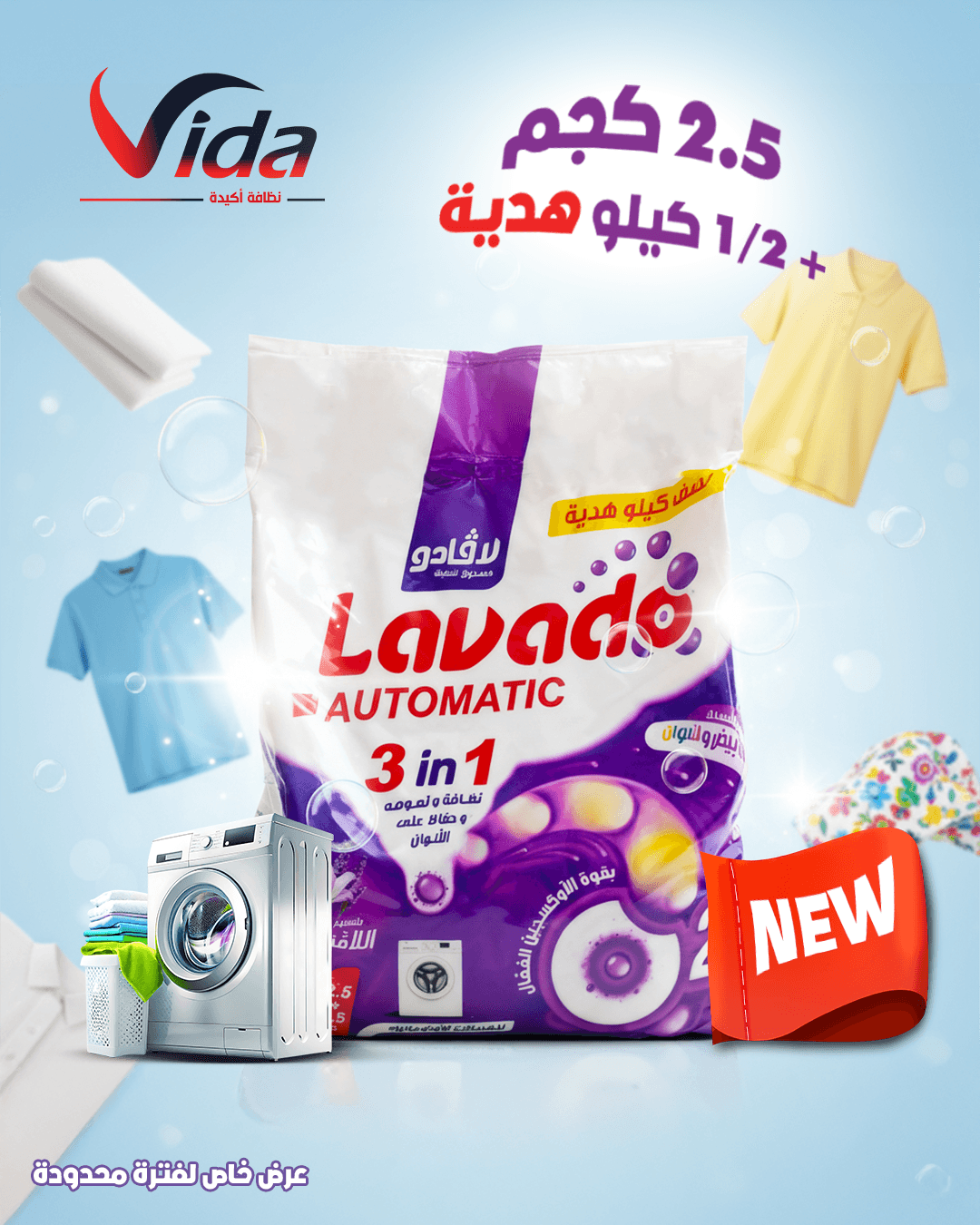 ويُعد «LAVADO» مسحوق غسيل مخصص للغسالات الأوتوماتيك، يأتي بعبوة ٢.٥ كجم + نصف كيلو هدية، ليقدم أداءً فائق النظافة ولمعانًا يدوم، بجودة تضاهي كبرى الماركات العالمية ، وبسعر مفاجأة يناسب كل بيت مصري .